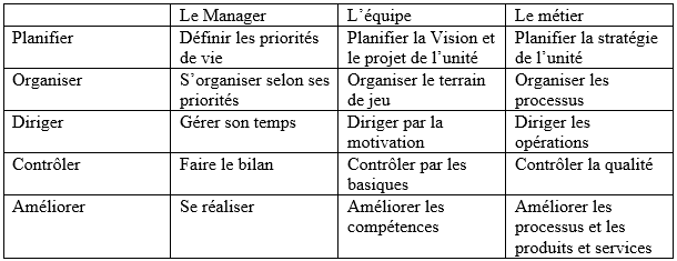 Le rôle du manager consiste à exercer un contrôle sur la planification, l'organisation, la direction et l'amélioration de trois domaines clés : le métier, l'équipe et lui-même. En ce qui concerne le métier, cela implique l'utilisation de processus et d'outils pour satisfaire les clients de l'entreprise. Le management de processus peut être utilisé pour distinguer la composante technique du métier de la composante processus.